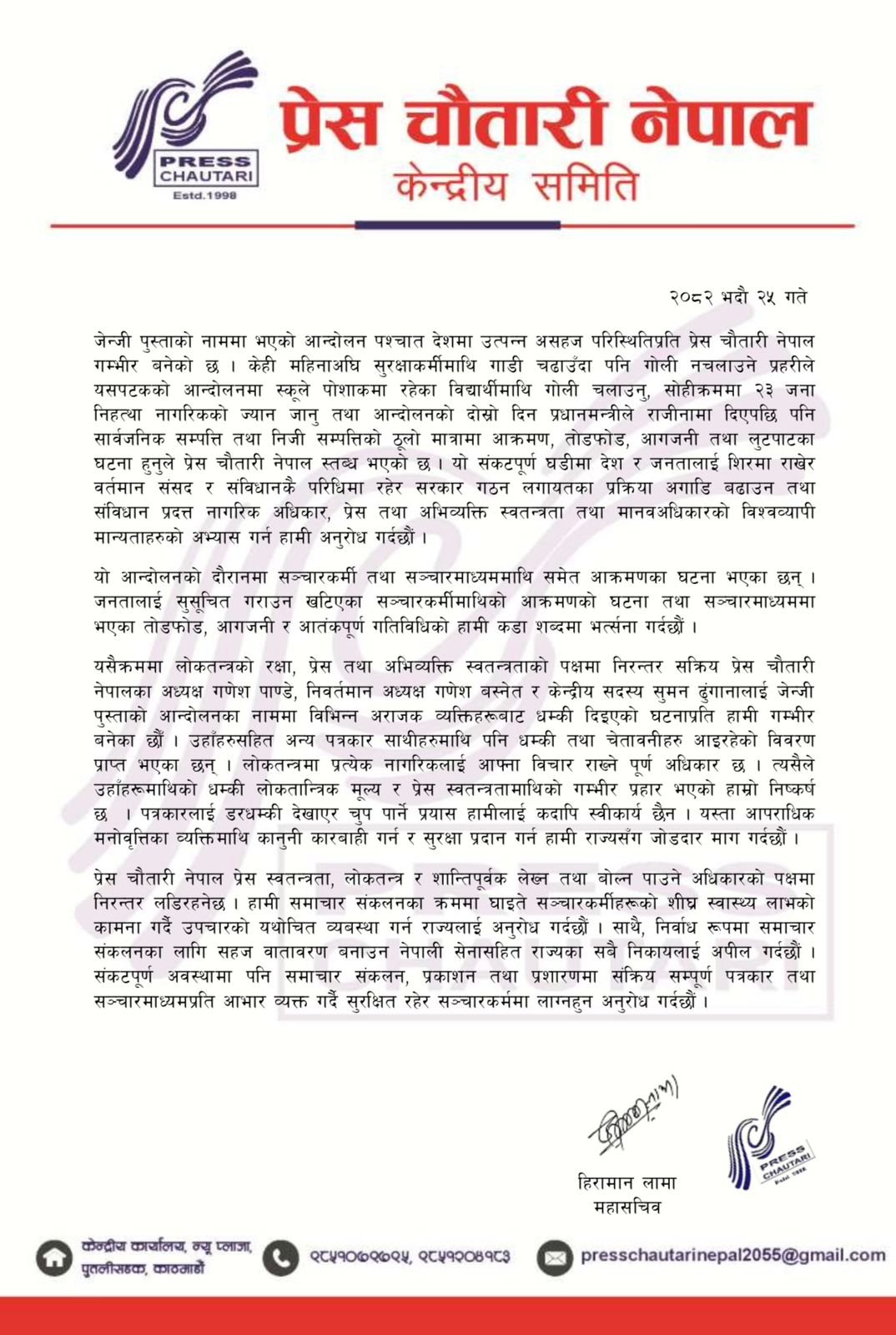 जेन्जी पुस्ताको नाममा भएको आन्दोलन पश्चात देशमा उत्पन्न असहज परिस्थितिप्रति प्रेस चौतारी नेपाल गम्भीर बनेको छ । केही महिनाअघि सुरक्षाकर्मीमाथि गाडी चढाउँदा पनि गोली नचलाउने प्रहरीले यसपटकको आन्दोलनमा स्कूले पोशाकमा रहेका विद्यार्थीमाथि गोली चलाउनु, सोहीक्रममा २३ जना निहत्था नागरिकको ज्यान जानु तथा आन्दोलनको दोस्रो दिन प्रधानमन्त्रीले राजीनामा दिएपछि पनि सार्वजनिक सम्पत्ति तथा निजी सम्पत्तिको ठूलो मात्रामा आक्रमण, तोडफोड, आगजनी तथा लुटपाटका घटना हुनुले प्रेस चौतारी नेपाल स्तब्ध भएको छ । यो संकटपूर्ण घडीमा देश र जनतालाई शिरमा राखेर वर्तमान संसद र संविधानकै परिधिमा रहेर सरकार गठन लगायतका प्रक्रिया अगाडि बढाउन तथा संविधान प्रदत्त नागरिक अधिकार, प्रेस तथा अभिव्यक्ति स्वतन्त्रता तथा मानवअधिकारको विश्वव्यापी मान्यताहरुको अभ्यास गर्न हामी अनुरोध गर्दछौं ।