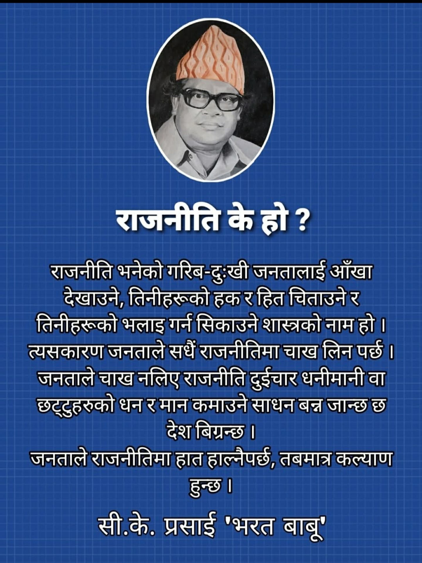 राजनीतिको परिभाषा दिन कठिन हुन्छ । तर “स्व. सी.के. प्रसाई (भरत बाबु)”ले दिएको व्याख्या सधैँ मार्गदर्शक रहन्छ –