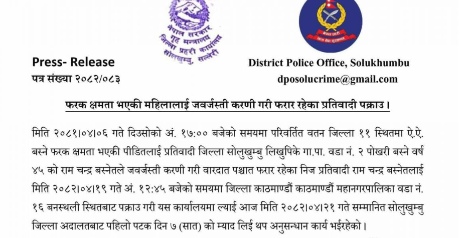 प्रहरी निरीक्षक विकास राईका अनुसार, पीडित महिला सुस्त मानसिक अवस्थाकी हुन्। घटनाबारे उजुरी परेपछि अनुसन्धान सुरु गरिएको थियो। प्रारम्भिक अनुसन्धानपछि बस्नेतलाई पक्राउ गरिएको र जिल्ला अदालत सोलुखुम्बुबाट आज सात दिनको म्याद थप गरेर थप अनुसन्धान अघि बढाइएको प्रहरीले जनाएको छ।