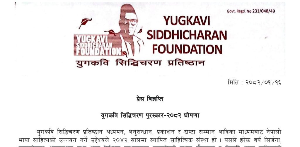 युगकवि सिद्धिचरण प्रतिष्ठानले एक विज्ञप्ति जारी गर्दै उक्त निर्णय सार्वजनिक गरेको हो।