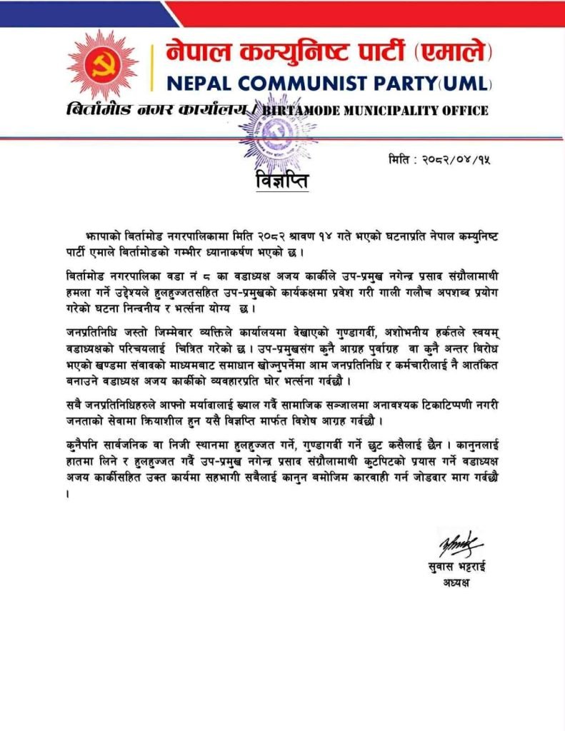 नेकपा (एमाले) बिर्तामोड नगर कमिटीले वडा नं. ८ का वडाध्यक्ष अजय कार्कीमाथि अनुशासन कारबाही गर्न माग गर्दै कडा आपत्ति जनाएको छ। नगर उपप्रमुख नगेन्द्र प्रसाद संग्रौलामाथि भएको अभद्र व्यवहारप्रति भर्त्सना गर्दै एमालेले सार्वजनिक विज्ञप्ति जारी गर्दै सो माग अघि सारेको हो।