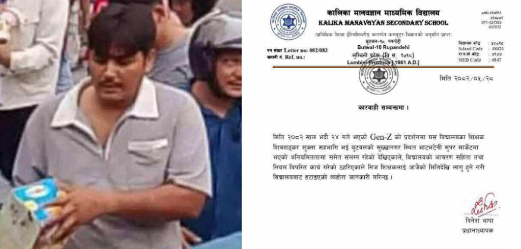 शुक्रबार मात्रै सार्वजनिक भएको तस्बिरमा विद्यालयका शिक्षक शिवशंकर शुक्ला बुटवल–८ सुख्खानगरस्थित भाटभटेनी सुपर मार्केटमा चोरीमा संलग्न देखिएका थिए । त्यसको केही घण्टामै विद्यालय प्रशासनले बैठक बसेर उनलाई पदमुक्त गरेको छ ।