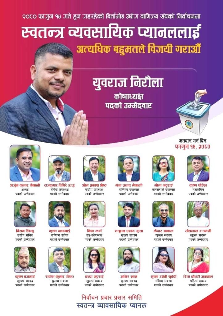 समाजको आर्थिक विकास तथा रूपान्तरणमा व्यावसायिक क्षेत्रले निर्वाह गरेको भूमिकालाई कसैले नजरअन्दाज गर्न नहुने दृढ मान्यता बोकेका निरौला बिर्तामोडका आम उद्योगी व्यवसायीले आफूलाई मत दिएर जिताउनेमा ढुक्क छन् ।