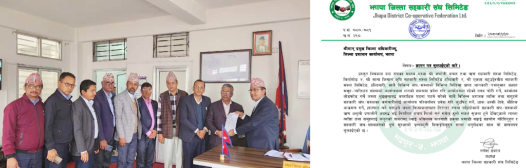 सोही क्रममा आज बिहीबार झापा जिल्ला सहकारी संघ लिमिटेडले पछिल्लो समय सहकारीमाथि बिभिन्न समुह तथा ब्यक्तिले आक्रमण गर्ने क्रम बढेकाले सुरक्षाको प्रत्याभूति गरिदिन माग राख्दै जिल्ला प्रशासन कार्यालय झापामा ज्ञापनपत्र बुझाएको छ ।