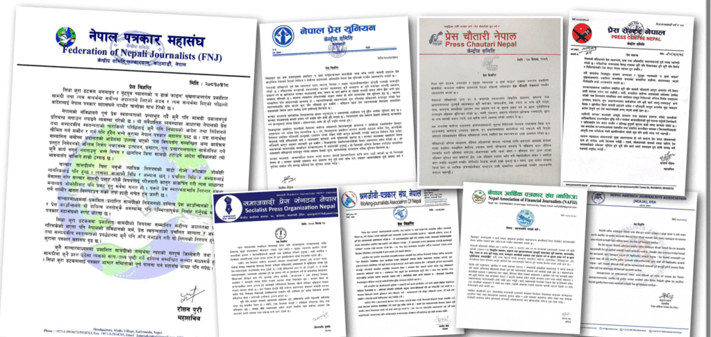 सर्वोच्चको आदेशप्रति प्रेस युनियन, प्र्रेस चौतारी नेपाल, प्रेस सेन्टर, समाजवादी प्रेस संगठनलगायत सरोकारवाला निकायले पनि विज्ञप्ति जारी गर्दै विरोध जनाएका छन् । चौतारीका अध्यक्ष गणेश बस्नेतले अदालतको आदेश संविधान र प्रेस स्वतन्त्रताको मर्मविपरीत रहेको बताए । ‘सर्वोच्च अदालतजस्तो गरिमामय संस्थाले नै संविधानप्रदत्त मौलिक हकमाथि यसरी अंकुश लगाउँदा लोकतन्त्रका लागि लामो संघर्ष र बलिदान गरेर प्राप्त भएको अधिकार कुण्ठित मात्र भएको छैन, अधिकार रक्षाका लागि सबै न्यायप्रेमीहरू सचेत र संगठित भएर अगाडि बढ्नुपर्ने गम्भीर परिस्थिति सिर्जना गरिदिएको छ । तसर्थ, उक्त आदेश तत्काल फिर्ता लिन वा न्यायिक प्रक्रियाभित्रैबाट सच्याउनुपर्छ,’ उनले भने ।
