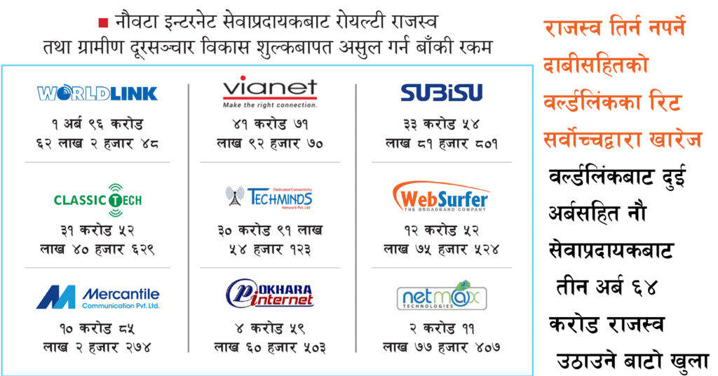प्रतिवेदनअनुसार नौवटा इन्टरनेट सेवाप्रदायकबाट रोयल्टी राजस्व तथा ग्रामीण दूरसञ्चार विकास शुल्कबापत कुल तीन अर्ब ६४ करोड रुपैयाँ रकम असुल गर्न बाँकी रहेको छ । जसअनुसार सबैभन्दा बढी वर्ल्डलिंक कम्युनिकेसनले एक अर्ब ९६ करोडभन्दा बढी तिर्न बाँकी छ । त्यस्तै, भायानेट कम्युनिकेसनबाट ४१ करोड, सुबिसुबाट ३३ करोड, क्लासिक टेकबाट ३१ करोड, टेकमाइन्डबाट ३० करोड, वेफसर्फरबाट १२ करोड, मर्कन्टायलबाट १० करोड, पोखरा इन्टरनेटबाट चार करोड र नेटम्याक्सबाट दुई करोड रुपैयाँ बक्यौता असुल गर्न बाँकी छ । महालेखाको बेरुजुदेखि मन्त्रालय तथा प्राधिकरणको अध्ययनबाट पनि करछली गरेको पुष्टि भएपछि त्यसले दूरसञ्चार प्रदायकहरूलाई दबाब सिर्जना गरेको थियो ।