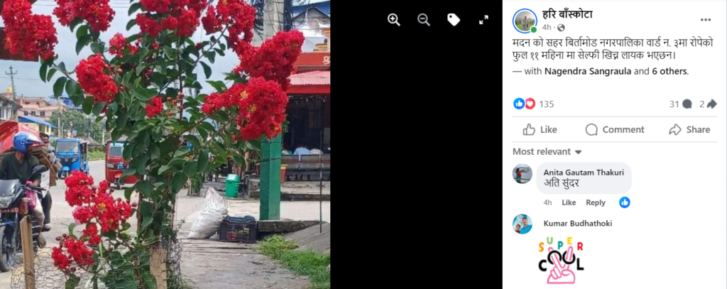 यो अभियान सफल भएको देखेर हरि बास्कोटा लेख्छन ,अव काठमाडौ बालेनको शहर भएजस्तो यो विर्तामोडको विर्ता बजार सैनिकमोड गरामुनी हरियाली मदन शहर भन्न लायक बनाउने कोशिश गरिरहेको बताउनुहुन्छ।