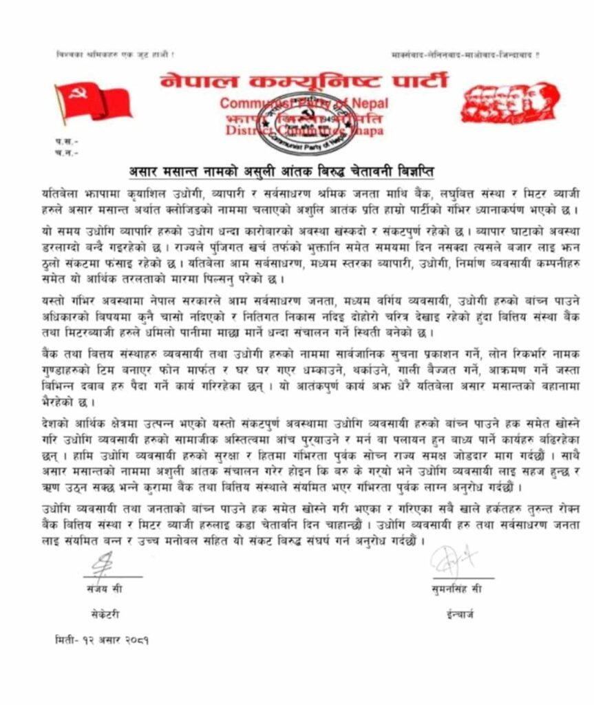 बिज्ञप्तीमा भनिएको छ ‘यतिवेला झापामा कृयाशिल उद्योगी, व्यापारी र सर्वसाधरण श्रमिक जनता माथि बैंक, लघुवित्त संस्था र मिटर व्याजी हरुले असार मसान्त अर्थात क्लोजिङको नाममा चलाएको अशुलि आतंक प्रति हाम्रो पार्टीको गंभिर ध्यानाकर्षण भएको छ ।’