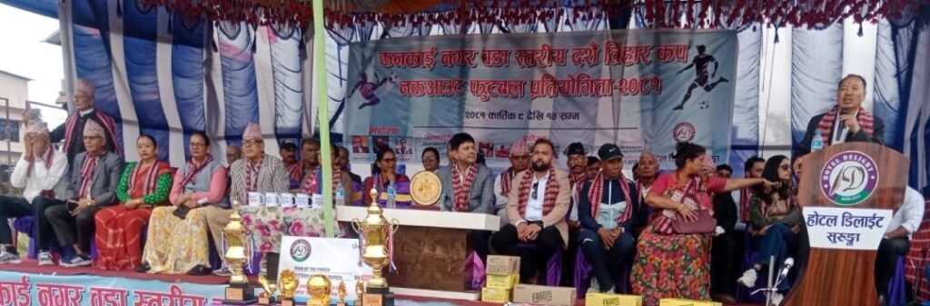 झापाको कनकाई—३,सुरुङ्गास्थित कनकाई माविको खेल मैदानमा संचालन भएको प्रथम वडास्तरीय दशैं तिहार कप फुटबल प्रतियोगिताको उद्घाटन विशेष समारोहलाई सम्बोधन गर्दै सांसद साँवाले मुलुकमा शान्ती सहितको समृद्धिका लागि अब खेलकुदसँग सम्बन्धित संघसंस्थाहरु सक्रिय हुनु पर्नेमा जोड दिए ।